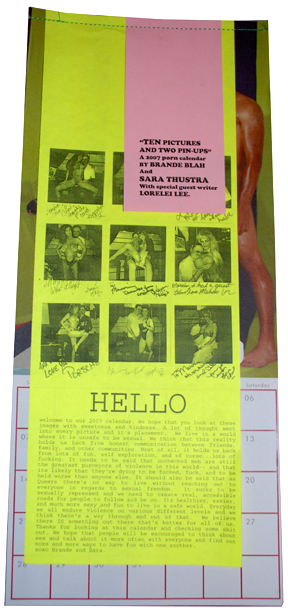 TEN PICTURES & TWO PIN-UPS A 2007 Porn Calendar by Sara Thustra and Brande Blah It's that time of year again and Sara Thustra once again out does himself this year with a 12 month photographic porn calendar. The calendar is self-described as "porn," but these aren't the kind of images that you'd see in Hustler or would be considered "sexy" by the status-quo. These are photos of gay, straight, bi, trans men and women of all colors shapes and sizes, The imagery has a thought provoking and gender neutralizing effect on the viewer. Personally, I think it's a great and refreshing cultural addition to the art world - a world that seems to have taken a boring mainstream turn these days with an overwhelming amount coke snorting off tits type photography. In this world, Sara Thustra's Calendar stands out by pushing real boundaries. Offset 4C Printing, Measures 7"x15" SOLD OUT (18 AND OLDER ONLY) |