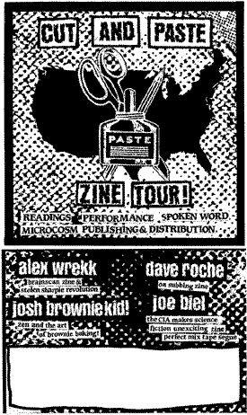 AUGUST 7th 2003 In the month of august 4 kids got in a car and crossed the country doing performances, readings and spoken word at various venues. the cut and paste tour will consisted of: Dave Roche- On Subbing zine Alex Wrekk- Brainscan zine and Stolen Sharpie Revolution Josh Browniekid!- zine and the art of brownie baking! zine |