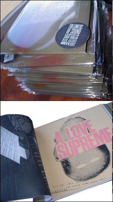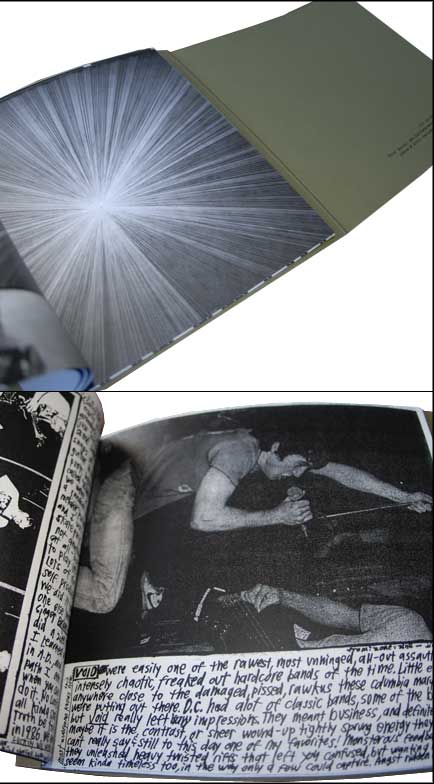 by Chris Duncan, Rich Jacobs, & Andrew M Scott Followers of Sound is a zine/art book project created by Chris Duncan, Rich Jacobs, and Andrew M Scott based on the idea of music and it's effect on humans. Each contributor submitted their own distinct and eclectic section for the book and then came together to hand assemble it into a cool matchbook styled book. The result is a collection of beautiful anecdotes, photographs, ephemera, art prints, and a spray painted/gocco screened cover. Faith/Void, Big Boys, Slint, Lungfish, Dischord, Pale Hoarse, Skaterock, and so much more - it's jam packed. Each book is unique, (no two are alike). Followers of Sound was released in conjunction with Move 18, a Rich Jacobs curated art exhibition entitled Listen with Your Ears and Eyes Wide Open, This Time. SOLD OUT • 52 Pages • Matchbook-style cover on card stock • 7.50" x 9" • Black & White/Color Photocopy, and Gocco Printed insides. • Paper stock and vellum. • Numbered Edition of 99 • 100% Fancy |
