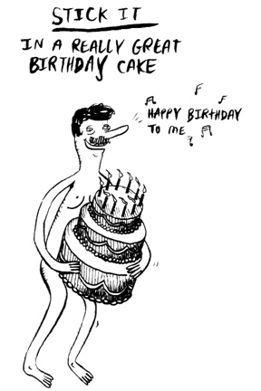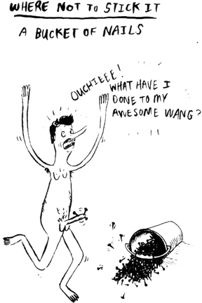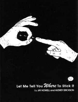 WHERE TO STICK IT by Jay Howell & Audrey Erickson Jay Howell knows a thing or two about a thing or two. A few months ago he told us some useful information about dogs. This time he teamed up with his pal Audrey Erickson to convey some more useful information to the world. More specifically, the two address the enternal human dilemma of "where and where not to stick it." The first half of the zine demonstrates to the reader many possible places that would be nice to stick it. On the flipside, (which is equally useful) the zine demonstrates many places that are not optimal for sticking it. You'd better get this zine before you find yourself sticking it in somewhere you regret....like a bucket of nails. 24 pages, 4"x6" Glossy/offset print , B&W. *ALSO Dogs and Dog Information |