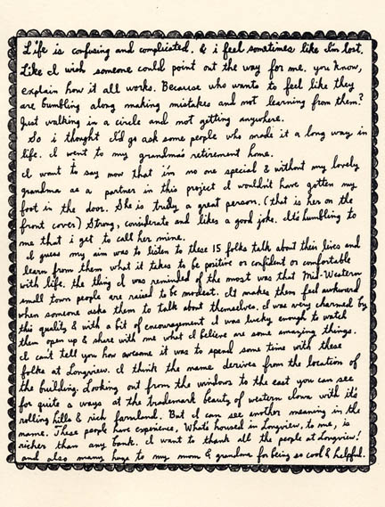 | Released in conjunction with her Needles & Pens solo show Advice Portraits, Long View is a zine project by Maria Forde that similarly deals with the concept of giving advice. Longview is comprised of portraits and words of wisdom from the residents of Forde's Grandmother's retirement home. Maria describes it this way: "Life is confusing and complicated and I feel sometimes like I'm lost. Like I wish someone could point out the way for me. You know, explain how it all works. Because who wants to feel like they are bumbling along making mistakes and not learning from them? Just walking in a circle and not getting anywhere. So, I thought I'd go ask some people who made it a long way in life..." Maria Forde This zine is amazing, but don't take my for it, see what The San Francisco Chronicle says about it in this article. $6.00 - - - - - • 36 Pages • Measures 5.5" x 4.25" • Color Card Stock Cover + Black & White Insides. • Numbered Edition of 100 - - - - - |