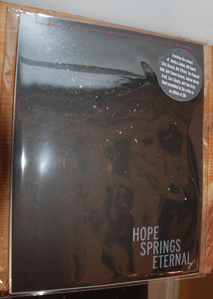 Catalog for Needles + Pens' Hope Springs Eternal Show at 96 Gillespie, London England. Opening February 29th, 2008 at London's 96 Gillespie - Needles + Pens' Hopes Springs Eternal showcases the work of 9 (mostly) San Francisco artists - Monica Canilao, Bill Daniel, Chris Duncan, Mat O'Brien, The Polaroid Kidd, Kyle Ranson, Sara Thustra, Paul Urich, and Andrew Martin Scott. The catalog accompanying the exhibition is a mind-bogglingly beautiful hand-made assembled gem. To call it a book, zine, or catalog is to sell it short, it in it's self, more closely resembles a piece of art. Each of the artists contributed two - five pages of silk-screened, stenciled, and/or hand-drawn pages which were sewn together by Monica Canilao. The covers were spray-painted and then Gocco printed by Andrew Martin Scott. 25 of these books will be available through N+P in San Francisco. SOLD OUT |